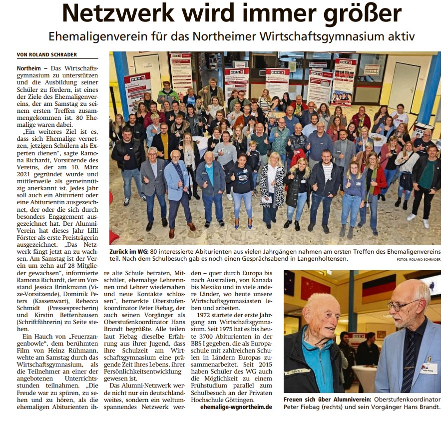 Die Erwartungen des Vorstandsteams an das erste Treffen des Ehemaligenvereins des Wirtschaftsgymnasiums Northeim wurde weitaus übertroffen! In dem veröffentlichten HNA Artikel lest ihr mehr!